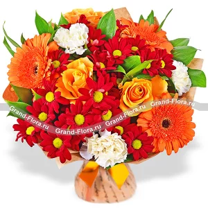 Букет оранжевых роз + хризантемы - Осенний коктейль