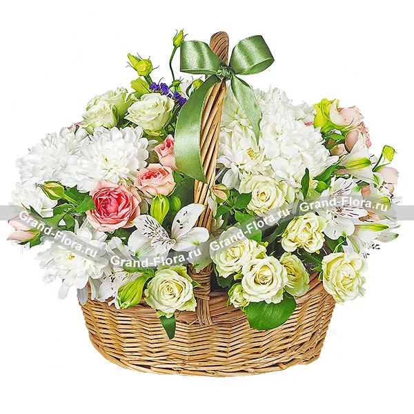 Стандартная (на фото): хризантема кустовая белая - 2 шт., роза кустовая белая - 2 шт., роза кустовая розовая - 3 шт., эустома белая - 1 шт., альстромерия белая - 3 шт., декоративная зелень, оазис, корзина средняя.