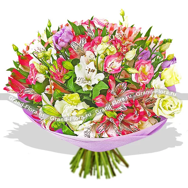 ДЕЛЮКС: эустома розовая - 6 шт., эустома фиолетовая - 6 шт., эустома белая - 5 шт., альстромерия розовая - 11 шт., альстромерия белая - 5 шт.,фетр светло-фиолетовый.