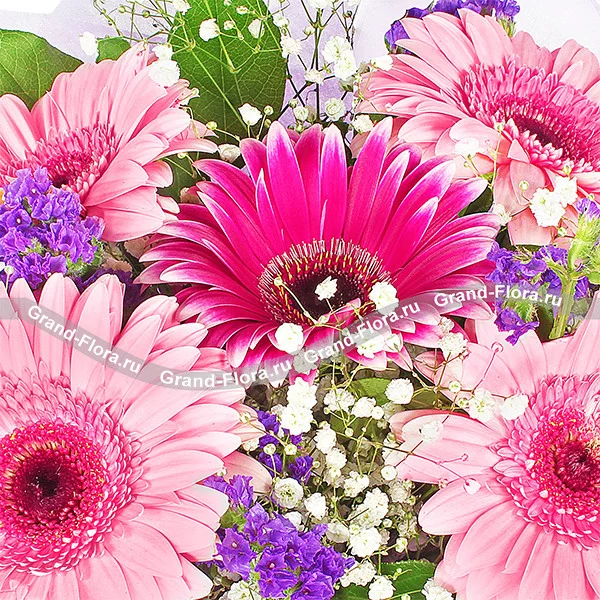 Нежный букет из розовых и малиновых гербер аккуратно оформлен статицей, гипсофилой и декоративной зеленью. Данная композиция будет прекрасным дополнением к подарку дорогой маме, сестре или подруге. Универсальный букет можно вручить как на день рождения, так и без особого повода.