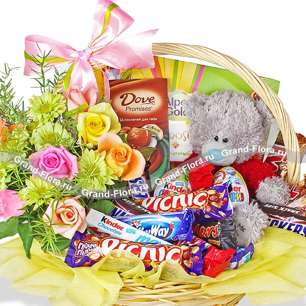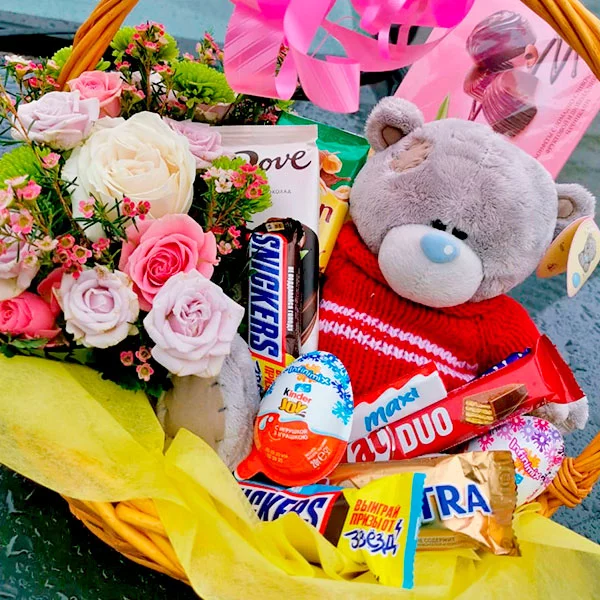 ЛЮКС: роза (микс) - 5 шт., хризантема (зеленая) - 2 шт.( возможна замена на хризантему другого цвета), декоративная зелень, оазис, корзина средняя, желтый фетр, розово-зеленый бант, мишка "Teddy" (возможна замена на плюшевого мишку)- 1 шт., коробка конфет "Alpen Gold" (163 г.) - 1 шт., шоколад Dove - 1 шт., Яйцо "Kinder" - 1 шт., Snikers (маленький) - 2 шт., Picnic - 1 шт., KitKat - 1 шт., Twix - 1 шт., Kinder Chocolate MAXI - 1 шт..