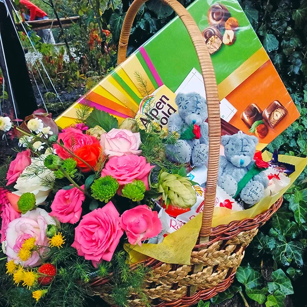 ДЕЛЮКС: роза (микс) - 7 шт., хризантема (зеленая) - 2 шт.,( возможна замена на хризантему другого цвета) декоративная зелень, оазис, корзина средняя, желтый фетр, розово-зеленый бант, мишка "Teddy"(возможна замена на плюшевого мишку) - 1 шт., коробка конфет "Alpen Gold" (163 г.) - 1 шт., шоколад Dove - 1 шт., яйцо "Kinder" - 2 шт., Snikers (маленький) - 3 шт., Picnic - 2 шт., KitKat - 1 шт., Twix - 2 шт., Kinder Chocolate MAXI - 1 шт..