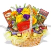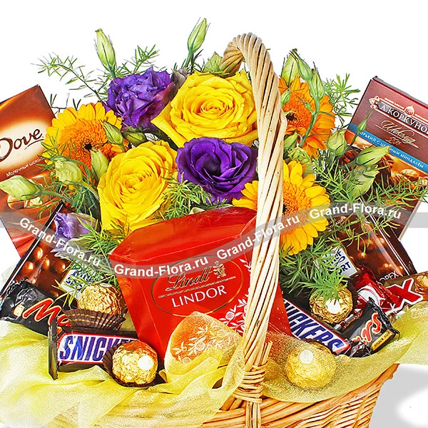 Стандартный: Snikers - 2 шт., Mars - 2 шт., Twix - 1 шт., конфеты "Ferrero Rocher" - 1 шт., шоколад "DOVE" - 1 шт., шоколад "Коркунов" - 1 шт., шоколад "Ritter sport" - 2 шт., конфеты "Lindor" - 1 шт., роза - 3 шт., эустома - 2 шт., герберы - 3 шт., декоративная зелень, оазис, декор, средняя корзина.