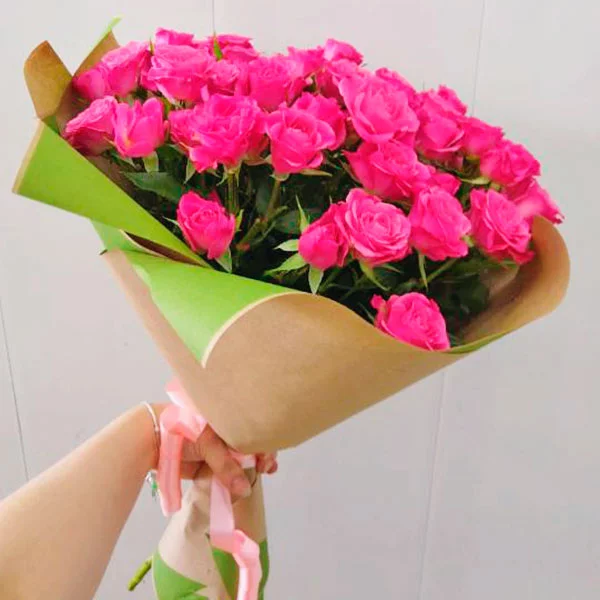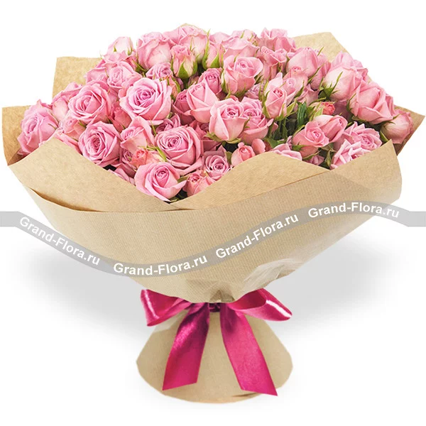 Стандартный: роза кустовая розовая - 9 шт, упаковка, лента розовая. Примерный размер: 25Х25 см.
