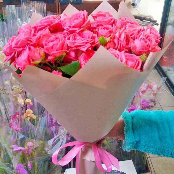 Уменьшенный: роза кустовая розовая - 5 шт, упаковка, лента розовая. Примерный размер: 20Х20 см.