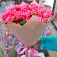 ДЕЛЮКС: роза кустовая розовая - 25 шт, упаковка, лента розовая. Примерный размер: 45Х45 см.