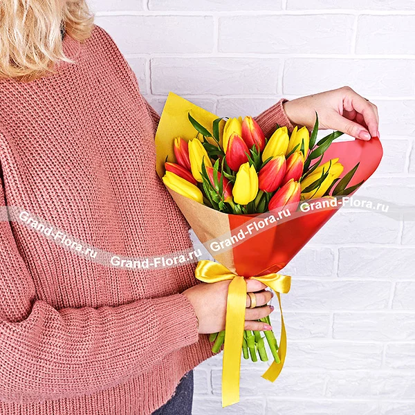 Букет выполнен из чудесных желтых тюльпанов и красочных красных тюльпанов, с яркими желтыми лепестками. Композиция окунает нас в воспоминания о прекрасных мгновениях жизни и наполняет сердце любовью и теплом. Высота букета от 30 см,а диаметр зависит от выбранного Вами количества цветов: Вы можете выбрать небольшой уютный букет, а можете преподнести своим близким целую охапку красочных тюльпанов. Обращаем Ваше внимание, что состав и оформление могут отличаться.