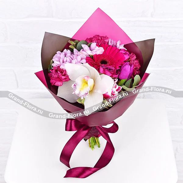 Уменьшенный: орхидея белая - 1 шт., гербера малиновая - 1 шт., хризантема кустовая розовая - 1 шт., эустома розовая - 1 шт., тюльпан розовый - 1 шт., тюльпан фиолетовый - 1 шт., роза кустовая фиолетовая - 1 шт., эвкалипт, упаковка, лента. Примерный размер: 20Х20 см. (тюльпаны не в сезон заменяются на розы, эустому или альстромерии в зависимости от свежей поставки)
