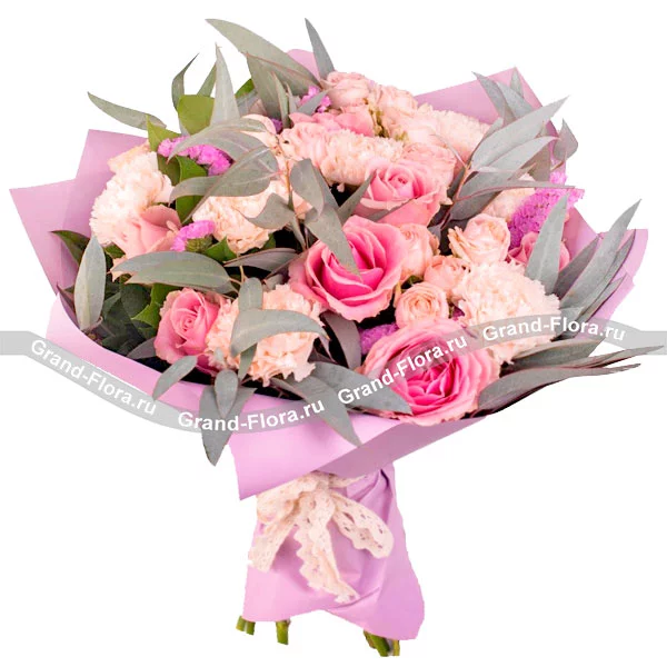 Розовый закат - букет из роз и гвоздик