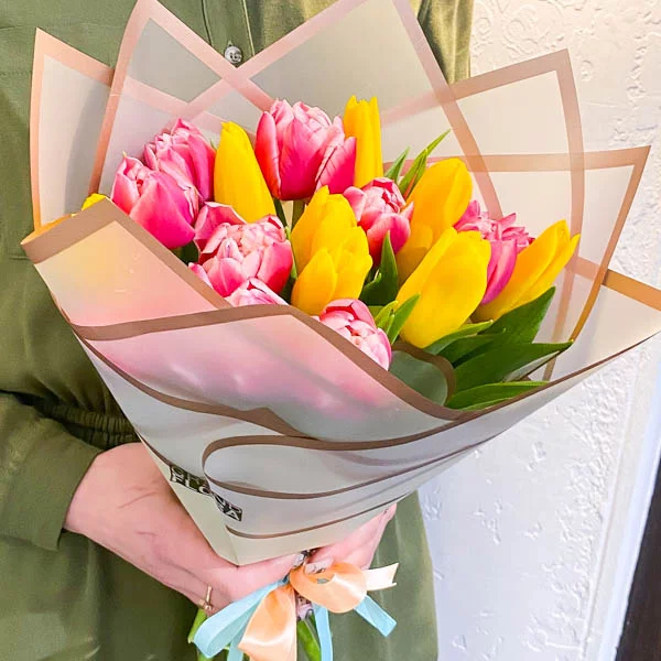 21 тюльпан: тюльпаны розовые и желтые- 21 шт., упаковка  , лента.