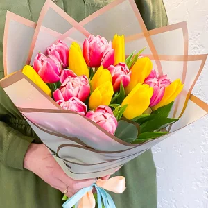 Букет розовых тюльпанов - это миллион поцелуев, которые вы можете подарить свей возлюбленной. Эта яркая и нежная охапка тюльпанов покорит сердце даже самой изысканной дамы, которая привыкла получать только дорогие и красивые вещи.